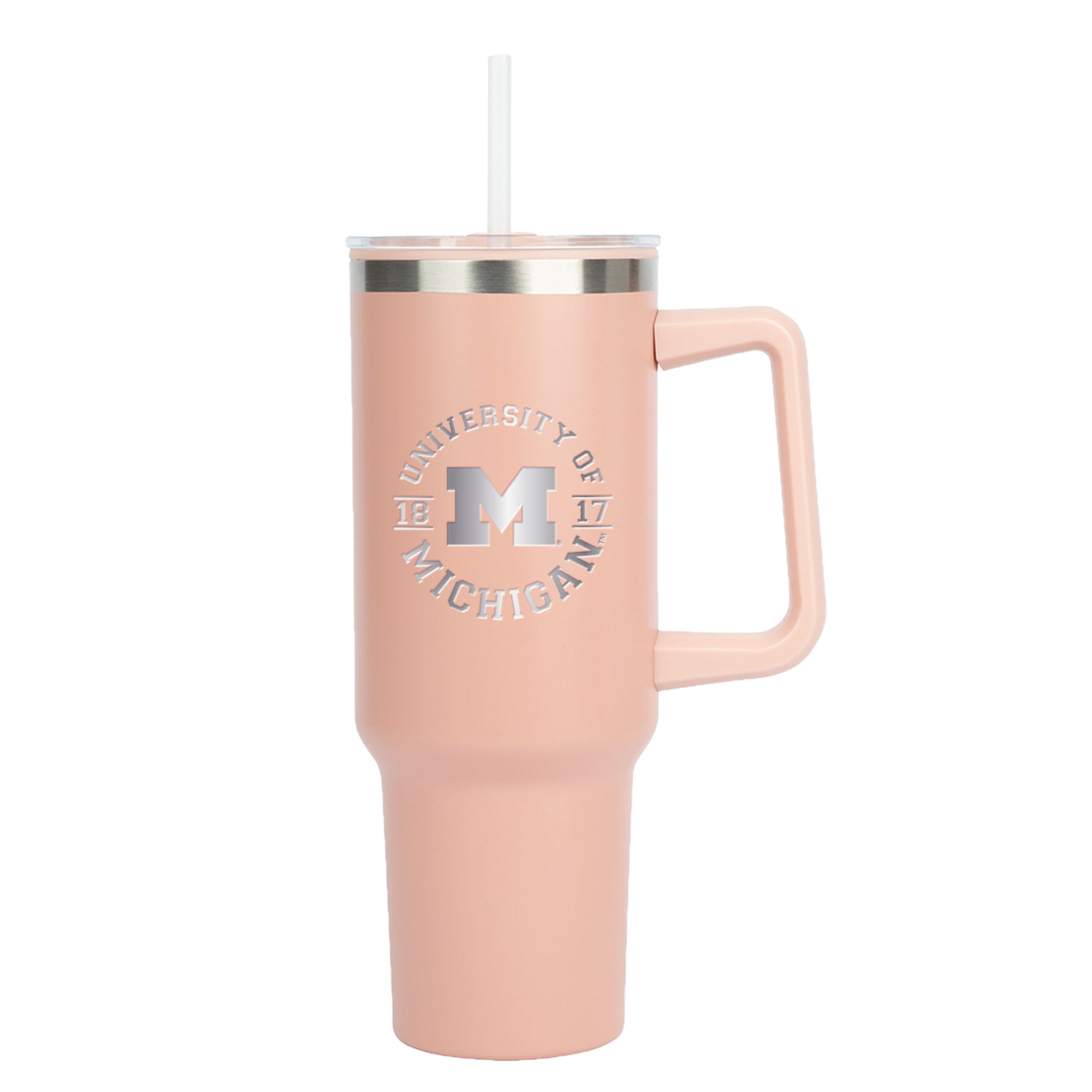 40 oz. double-wall construction. Stainless Steel Outer, Polypropylene Inner. Push-on clear lid with rotator closure. Silicone Seal. Polypropylene dinking straw. Ergonomic handle. Laser engraved graphic.
