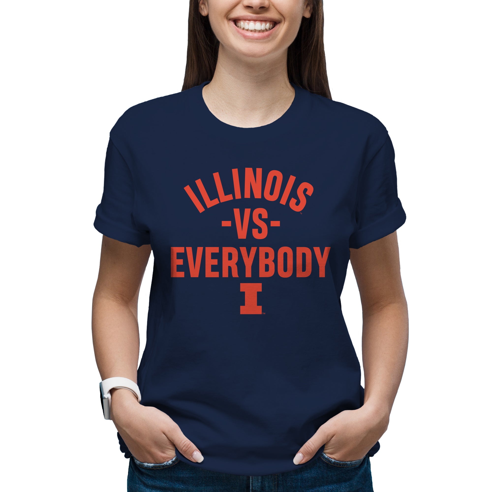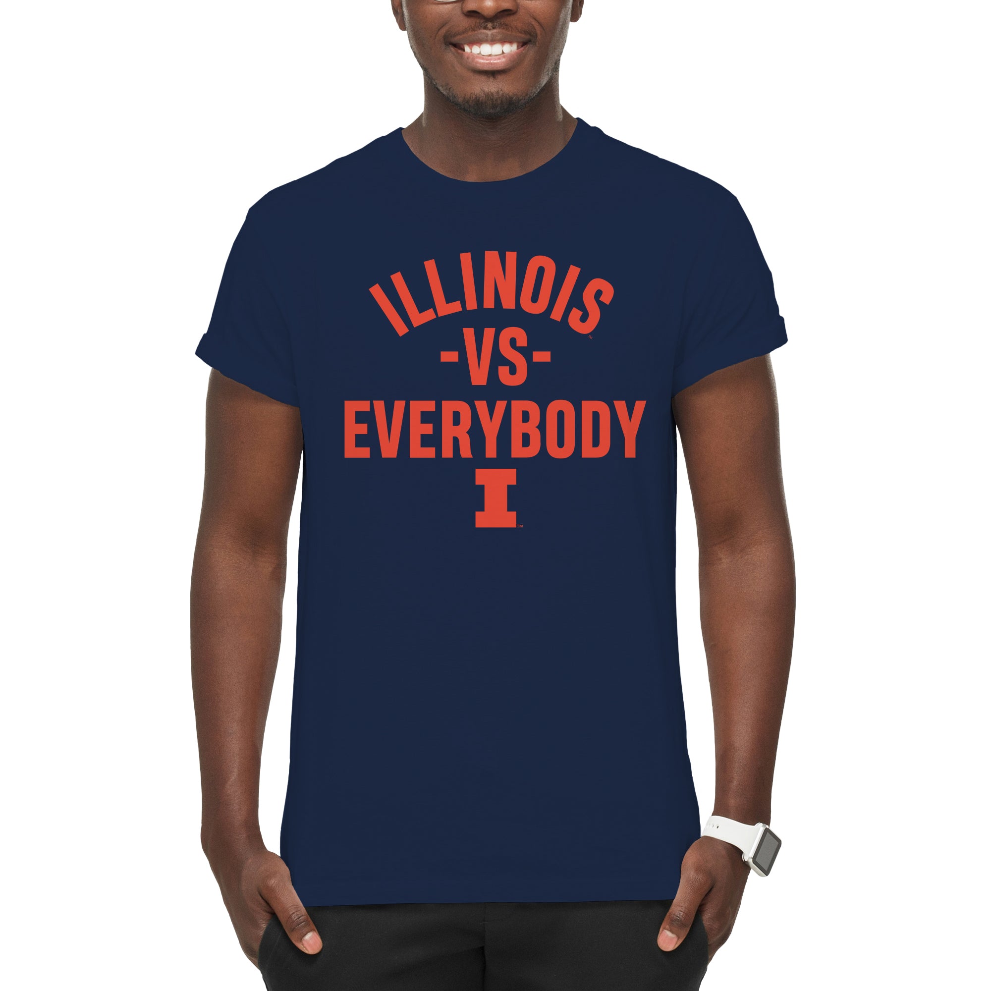 • Show off your style in this great Illinois Fighting Illini Versus Everybody T-Shirt! Whether you are tailgating at a Illinois football game, or in the stands cheering on the Fighting Illini Basketball team, show off your Illinois Pride in this T-Shirt. Great for Christmas gifts, birthdays or just to treat yourself to a great graphic tee.