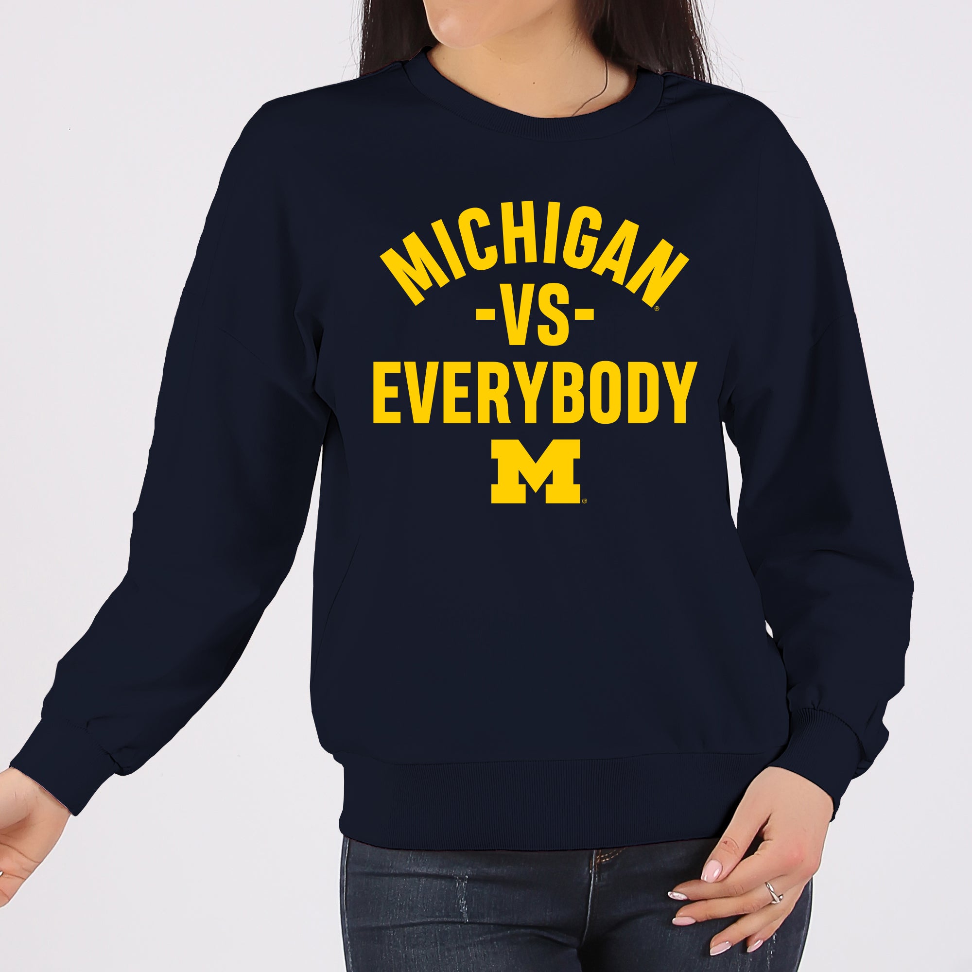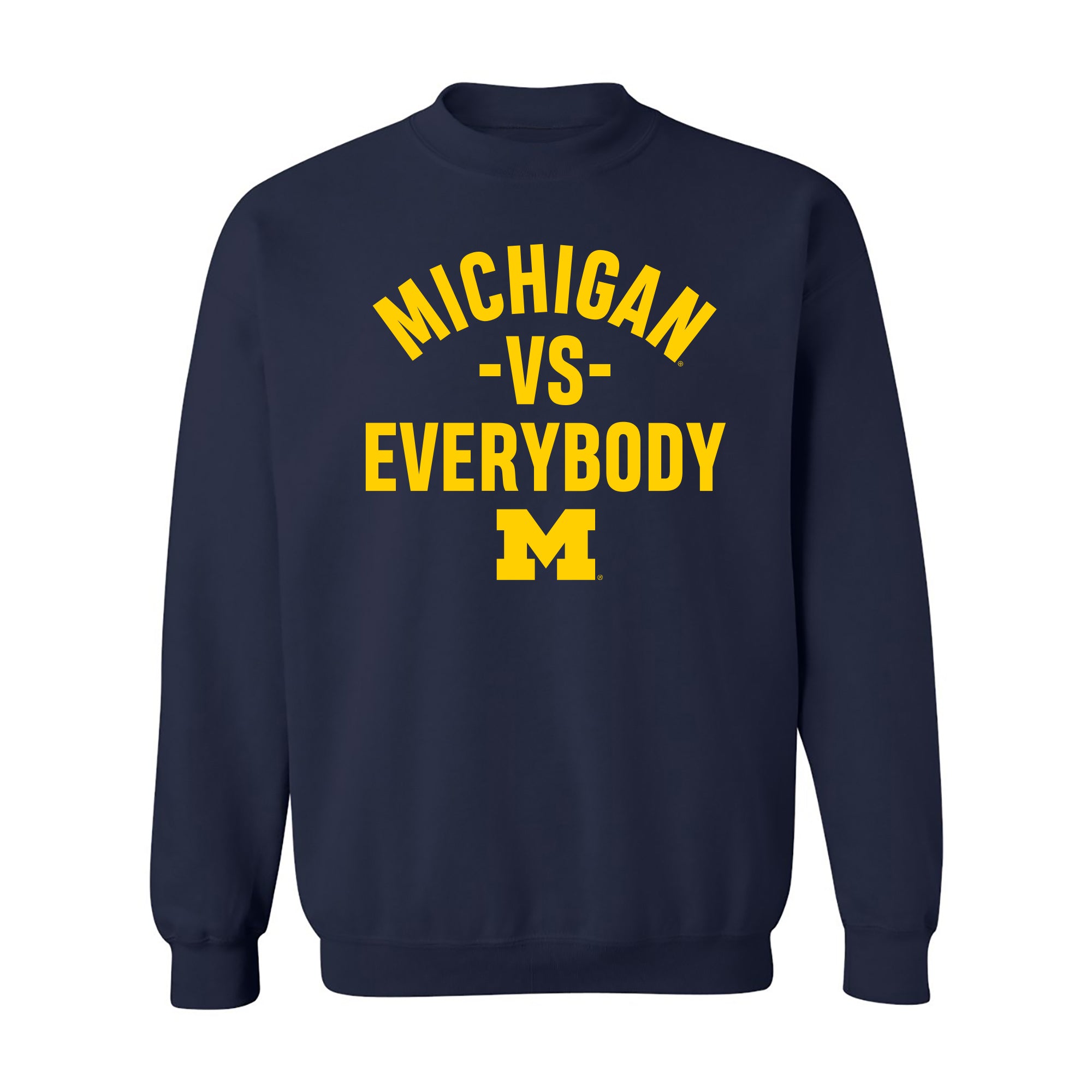 - Show off your style in this great Michigan Wolverines Versus Everybody crewneck sweatshirt! Whether you are tailgating at a Michigan football game, or in the stands cheering on the Wolverines Basketball team, show off your Michigan Pride in this crewneck sweatshirt. Great for Christmas gifts, birthdays or just to treat yourself to a great graphic tee.