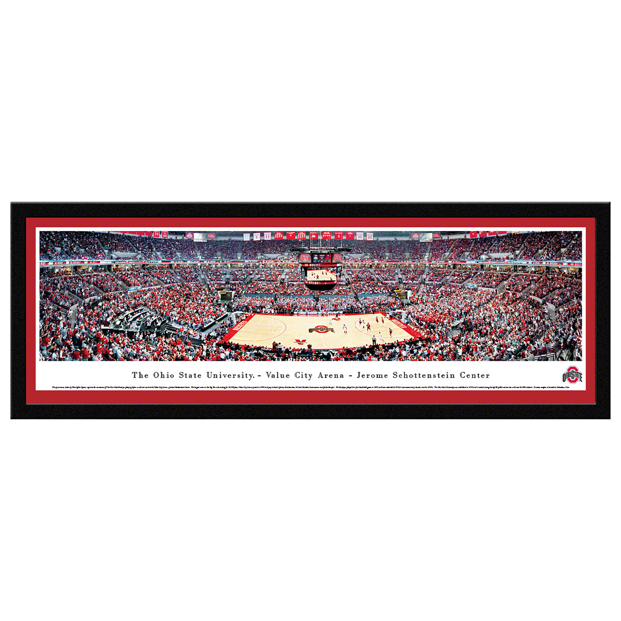 This panorama, taken by Christopher Gjevre, captures the excitement of The Ohio State Buckeyes® playing before a sold-out crowd at the Value City Arena - Jerome Schottenstein Center. The largest arena in the Big Ten with seating for 19,500 fans, Value City Arena opened in 1998 and pays tribute to Jerome Schottenstein, the late Columbus businessman and philanthropist. The Buckeyes® played their first basketball game in 1898 and have attended the NCAA tournament every decade since the 1930's. The Ohio State University was established in 1870 and is ranked among the top 20 public universities with over 64,000 students. Its main campus is located in Columbus, Ohio.