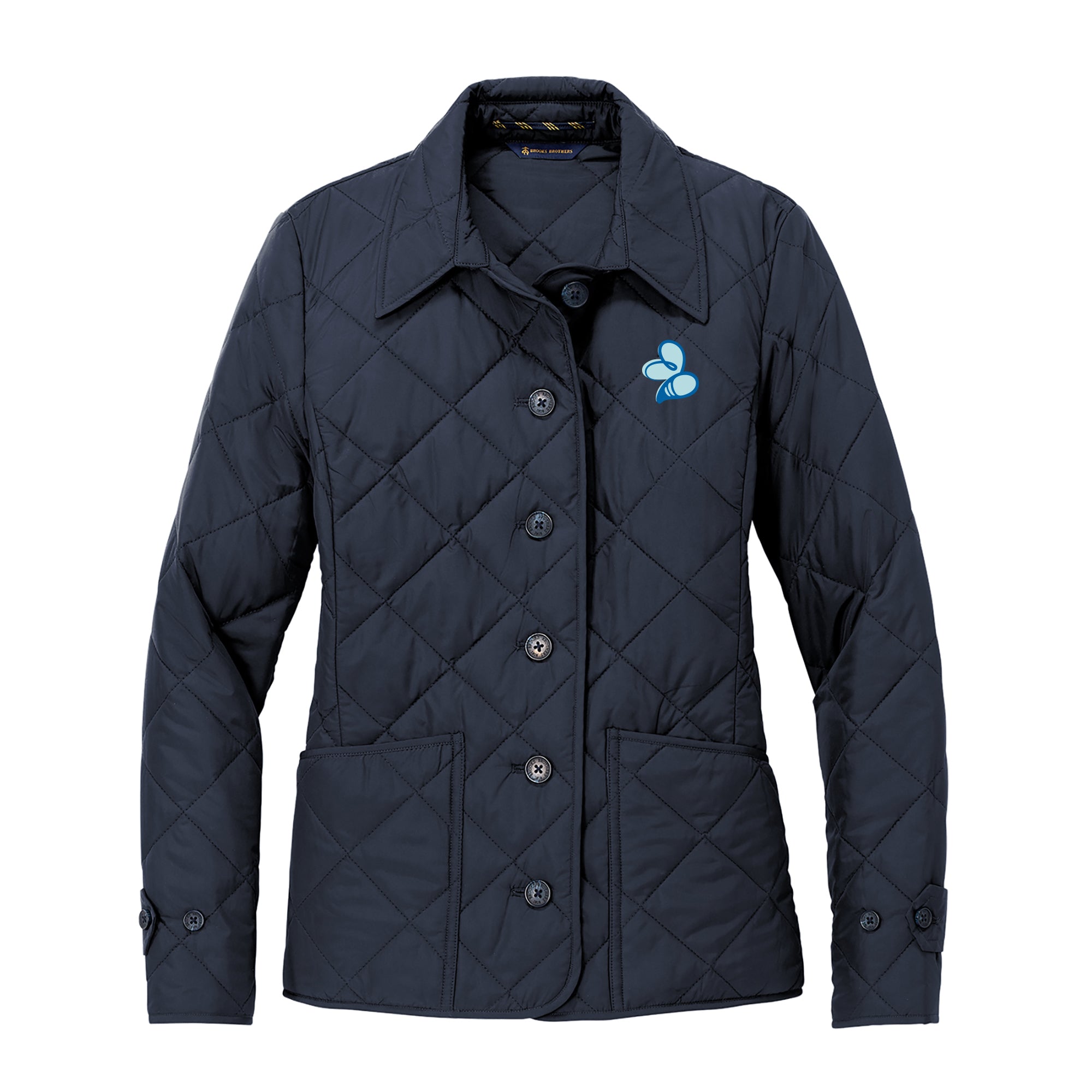 - Embroidered on Brooks Brothers Womens Quilted Jacket - 100% polyester shell and lining, polyfill insulation, Brooks Brothers tie-stripe hanging loop. Faux horn Brooks Brothers logo buttons. Front patch pockets. Adjustable tabs at cuff. Brooks Brothers tartan plaid-bound interior seams and lined front pockets