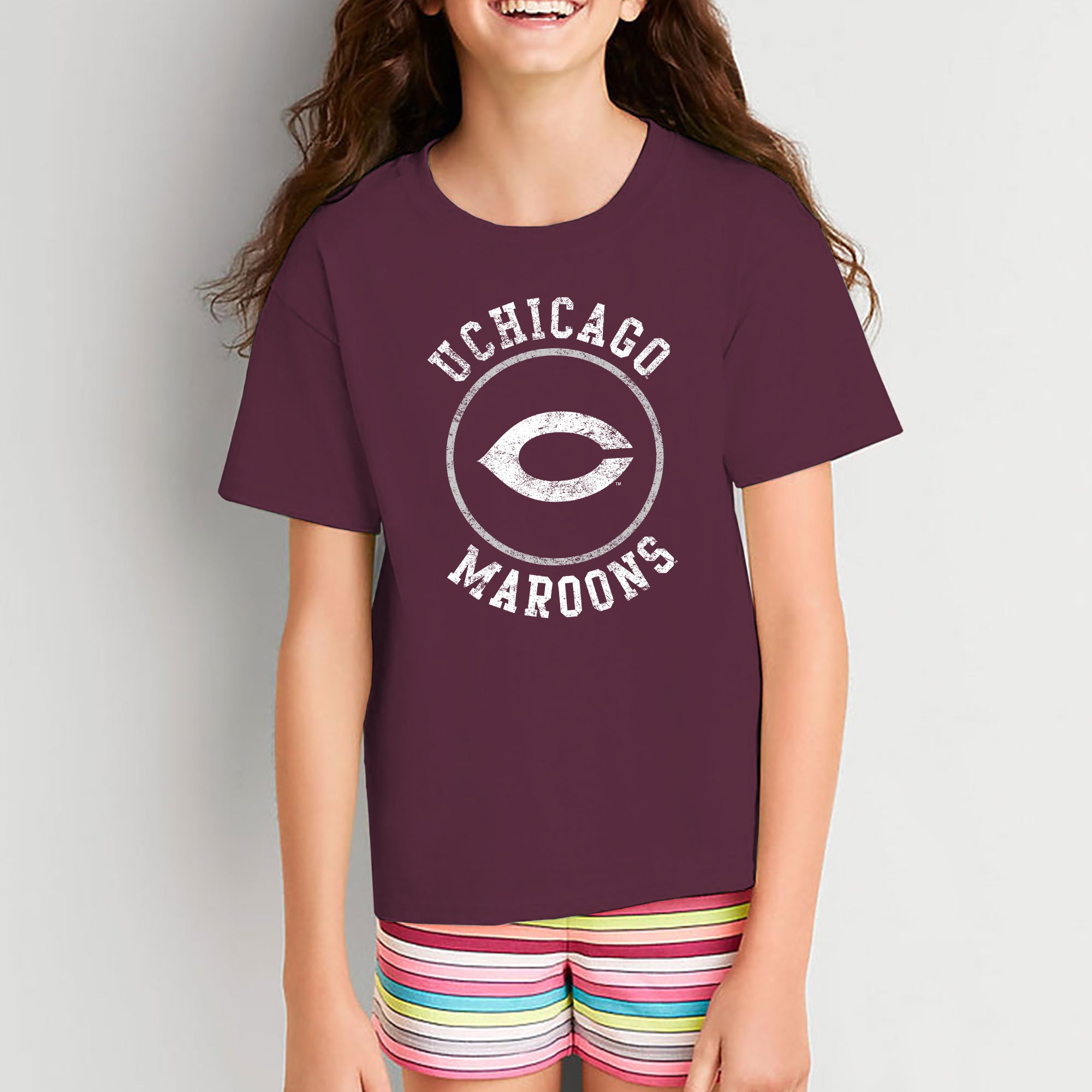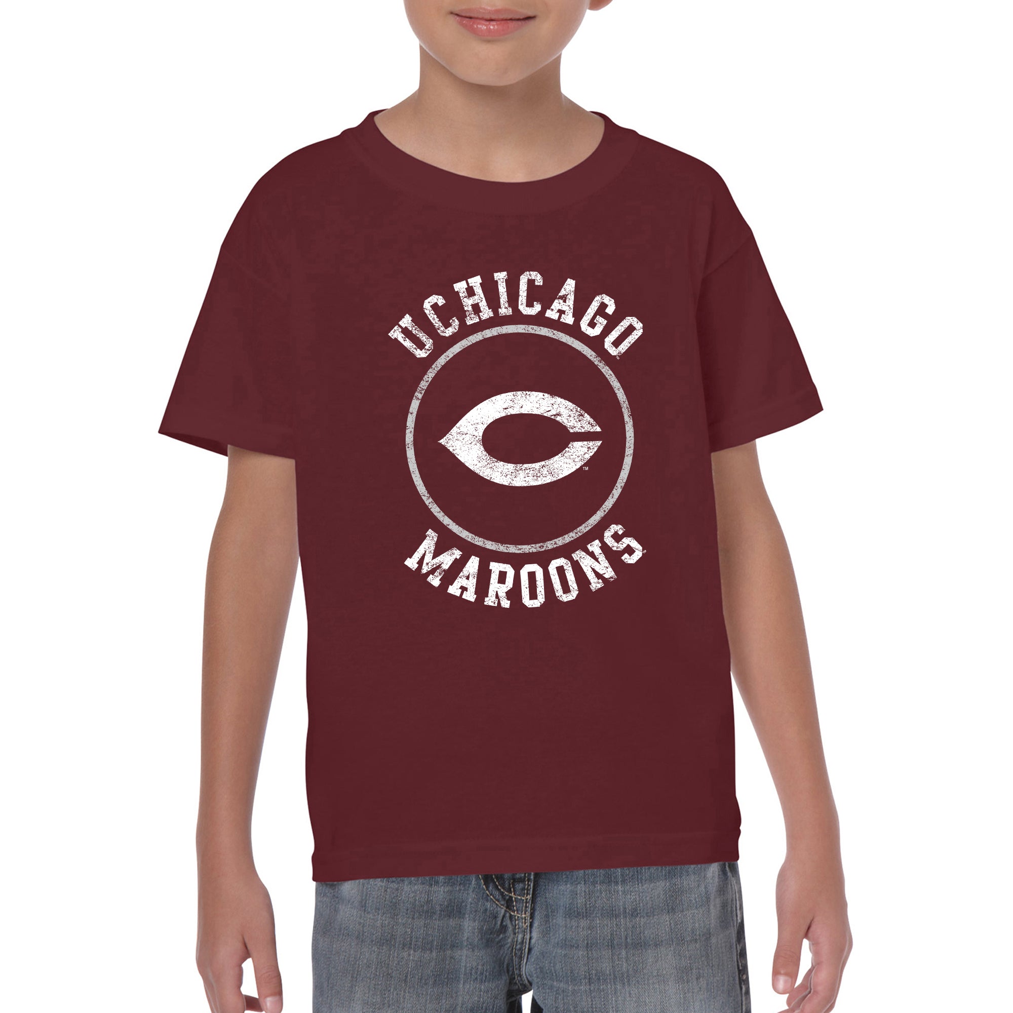 University of Chicago Maroons Distressed Circle Logo Heavy Cotton Short Sleeve Youth T Shirt - Maroon